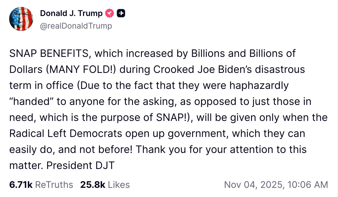 Trump does seem to be at least somewhat aware that things are not going well for him. His approval rating is in the toilet, with a double digit negative deficit for the first time this term, voters are again mostly blaming him and Congressional Republicans for the shutdown, and Democrats won massively in elections around the country this week, campaigning on affordability. So now he’s having big ol’ tantrums, trying to push the blame for the shutdown on Democrats, crying that he and the Republicans are better for affordability which … just no.