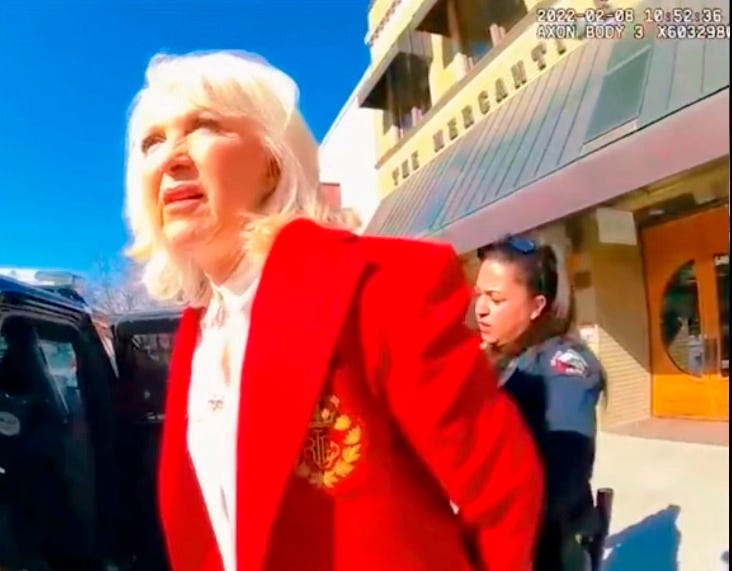But uh oh, while Peters was away at MyPillow Mike Lindell’s Cyber Fraud Hootenanny and Pillow Fluffing Party in August 2021, peddling her wild claims of FRAUD, somebody raided her office! And then two of her co-conspirators flipped on her. Which made her so pissed she recorded one of her co-conspirators in court on her iPad! That is not allowed, so then mean cops came to arrest her in a coffee shop for it.