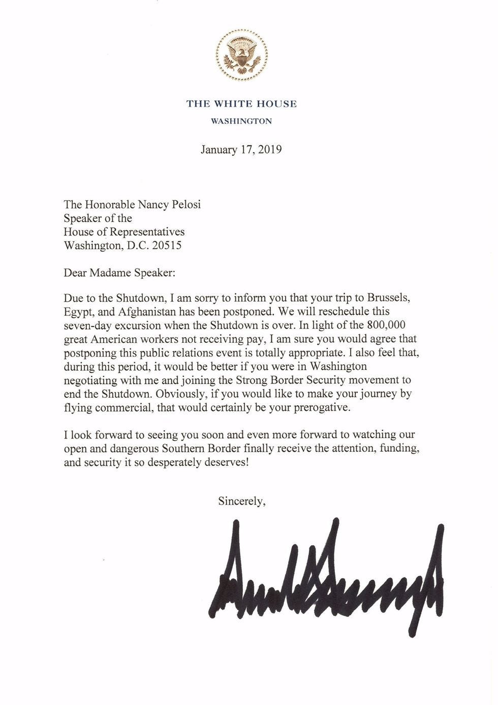 Pelosi had been scheduled to leave this afternoon on a overseas CODEL (congressional delegation) to Afghanistan, a trip that was supposed to be a secret, because all trips like that are supposed to be a secret, especially when you're dealing with the person second in line to the presidency flying into war zones. Trump might know this, because he secretly went to Iraq over Christmas during the shutdown, after he was shamed into it, and he complained about how dark it was on Air Force One, because they had to keep it dark for security reasons.