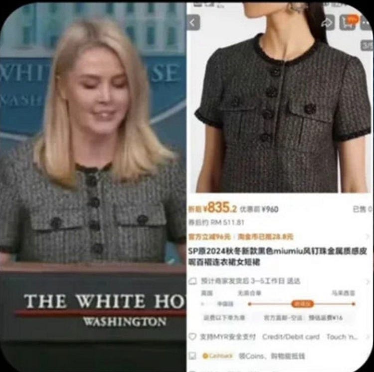 Or maybe it was how he had been waiting by the phone for China to call him with tears in their eyes, saying “sir, please, sir, we are but humble peasants, please spare us the tariffs,” but his phone did not ring, and it was them. Instead China’s Ministry of Finance released a statement that the US “will become a joke in the history of the world economy,” the director of the Hong Kong and Macau Affairs Office said, “let those peasants in the United States wail in front of the 5,000 years of Chinese civilization,” and the Chinese took to social media to post videos of AI Trump working in a factory, and pointing out the origins and prices of Karoline Leavitt’s sophisticated-lady jackets. You may not be able to criticize the Chinese government in China, but you sure can mock the fuck out of ours all day long!