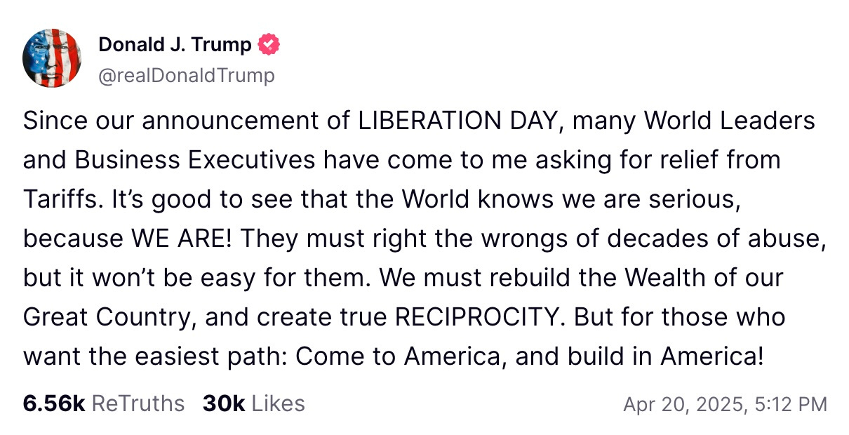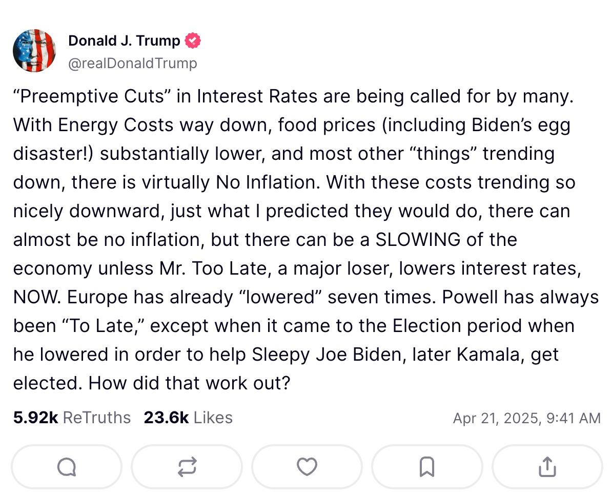 Well, well, well, look who is backing down on tariffs yet again, telling reporters on Tuesday that tariffs on China “will come down substantially,” that he doesn’t want to “play hardball” with China, and furthermore swearing he would never fire Jerome Powell, and never had any such intention, nope: “None whatsoever. Never did.” Don’t believe your lying eyes and ears! Watch him say these things if you want, ugh.