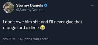 Necheles entered into evidence a tweet from Daniels in November 2022 that said, “I don’t owe him shit and I’ll never give that orange turd a dime (crying laughing emoji)."
