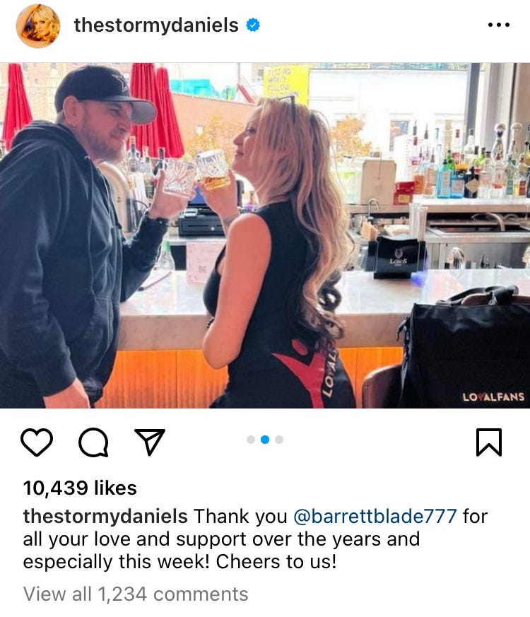 Meanwhile, Stormy posted a happy pic toasting with her cutie husband to her Insta. Where’s your spouse, Donald?