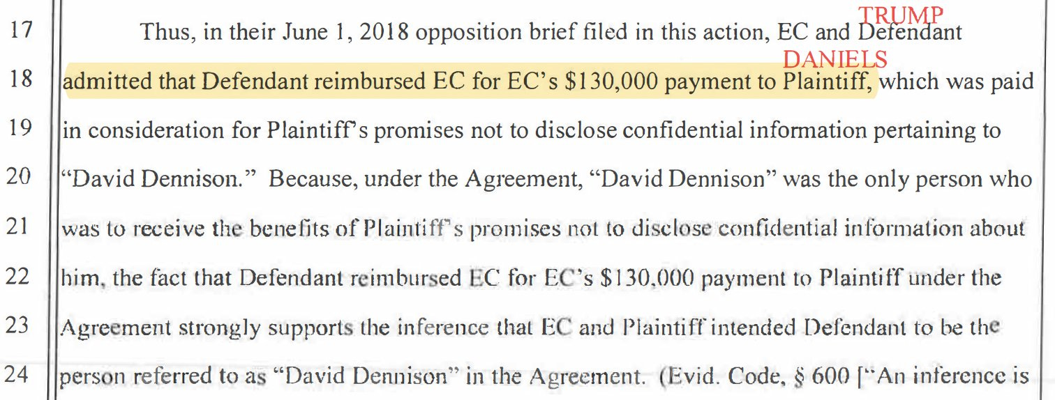 “Trump admitted that Defendant reimbursed EC for EC’s $130,000 payment to [Daniels].” Whadoops!