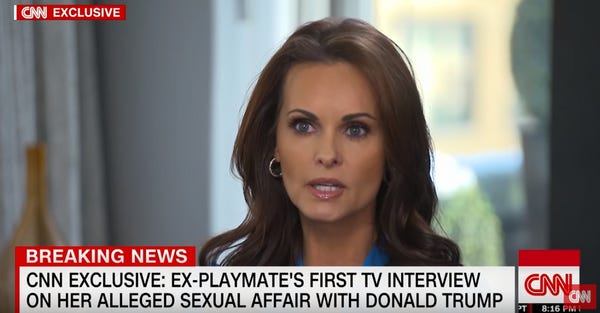 Where we left off, McDougal was explaining why she didn't initially want to come forward about her affair with Trump, because she really had no hard feelings toward the guy. Unfortunately, rumors started to come out and she decided she had to get in front of the story. Long story short, she came forward to the people who own the National Enquirer , they passed on it, then she went to ABC, then she got cold feet. THEN Trump got the Republican nomination, and the Enquirer was suddenly interested again, not because they wanted to tell her story, but because they are BFFs with Trump and wanted to kill it. (Lawyer machinations are involved, just watch the thing.)