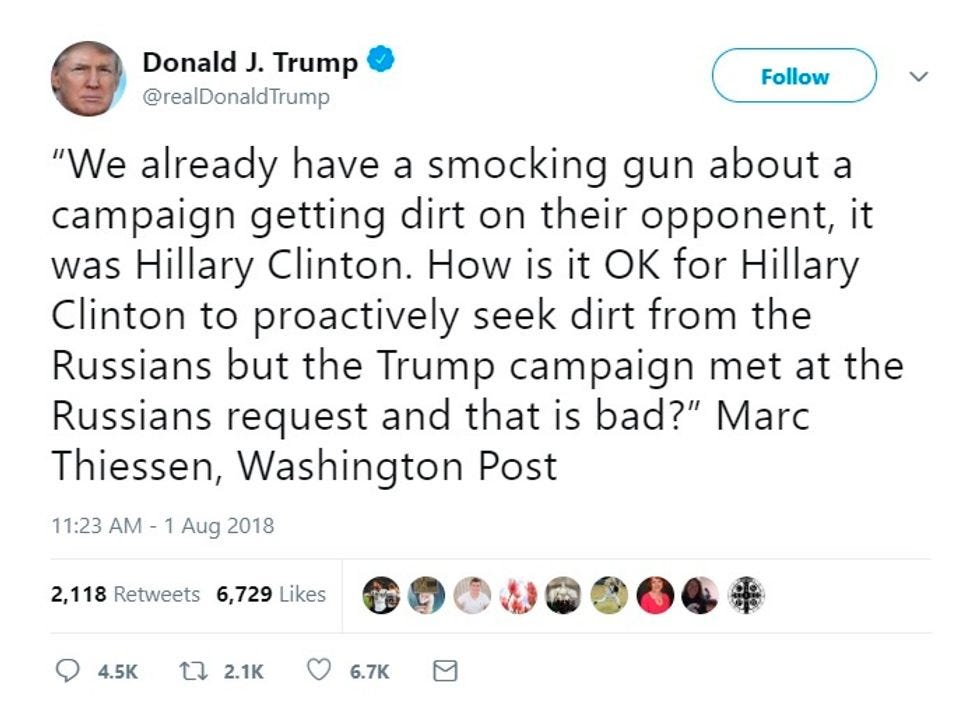 But did Trump really just order his (recused) attorney general, Jeff Sessions, to kill the investigation in a tweet? Right now when we know special counsel Robert Mueller is literally analyzing Trump's tweets to help determine his intent to obstruct justice in the Russia investigation, particularly focused on his tweets directed at Jeff Sessions? Yes, he did! Hey, Mueller! We got you some evidence tied up with a bow, with cream and sugar on top! YOUR FAVORITE!