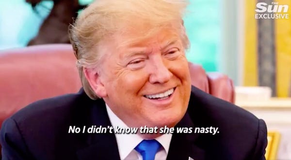Late last night, several news outlets reported that Donald Trump called Meghan Markle "nasty" after hearing that she had called him a misogynist and said she wanted to leave the country if he was elected. Which, duh, she did. Naturally, people thought that was a pretty gross thing to say about the Duchess of Sussex. Well,some people. Other people, the people who voted for this audibly tan dumpster fire of a human being, were probably quite pleased.