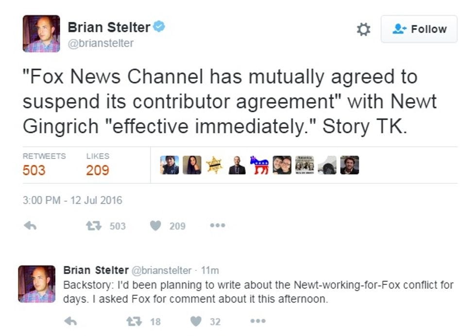 "Due to the intense media speculation about Gingrich's potential selection as Donald Trump's vice presidential candidate, we felt it best to halt his contributor role on the network to avoid all conflicts of interest that may arise," executive vice president for news Jay Wallace said.