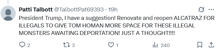 There is also the weird possibility that Trump may have gotten the Alcatraz idea from some Twitter rando who tweeted this at him a couple of hours before he made his announcement: