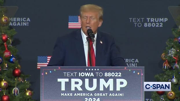 Last night in Iowa, Trump doubled down on the word salad and doubled down on the Hitler. On the word salad, he babbled about how he’s always saying they’re emptying out “insane asylums” to send people across the American border. He said people say he shouldn’t say “insane asylums,” but he feels he needs to say it. Why? Because in his stunted brain, it is 1905, the year his mangled father was born, and “insane asylum” is a normal thing to say.