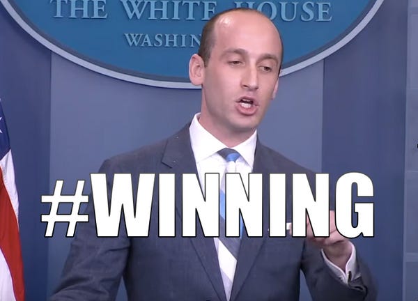 We are 95 percent certain that Miller's antics at yesterday's presser were unplanned and that the White House unleashed the little runt in hopes that he'd get good publicity for the law. The days of us thinking that Bannon was playing nine-dimensional chess are long gone. On the other hand, we are all talking about it today...