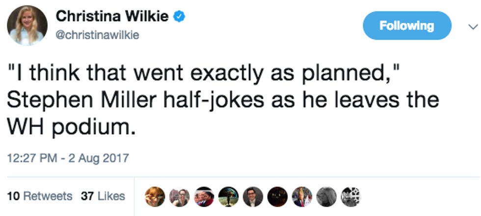 Helluva presser yesterday, boys! That Miller kid is a messaging whiz! General Kelly really has that White House on lockdown. Everything's running with military precision now that you got rid of Spicey and Reince.