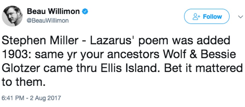 Which is why we got that rancid little weenus Stephen Miller at the podium during the White House press briefing, shittalking the Statue of Liberty. Because no one turns a bullshit nothingburger into a BIG STORY like that asshole . Through sheer obnoxiousness, he manages to make headlines out of the ENGLISH ONLY dogwhistle, when everyone knows it will never happen.