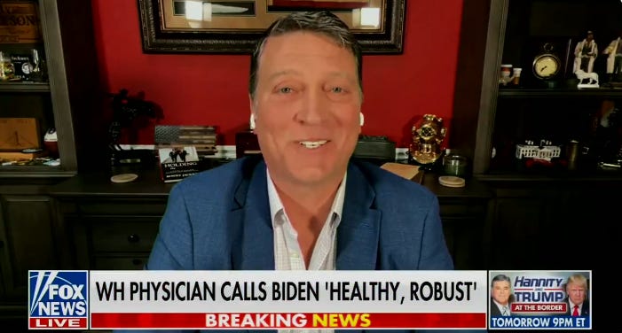 And behind all of it was Ronny Jackson, the lunatic physician to the president (now Republican congressman) probably best known for claiming Trump was the healthiest hunk of man-meat to ever walk the White House halls, even though the entire public knew the man ate so much McDonald’s that he was approximately 75 percent cheeseburger. (Related: Ronny Jackson thinks Joe Biden’s physical was a “complete joke.” That’s it, that’s the punchline.)