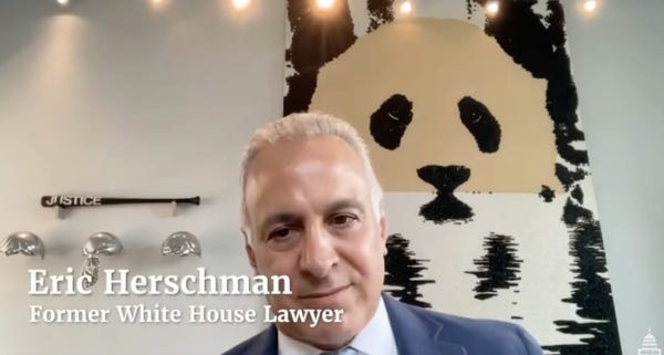 Why, yes, Herschmann is the same guy who threatened to beat up the Overstock.com weirdo and Mike Flynn during the infamous December 18, 2020, Oval Office showdown and testified to the House January 6 Select Committee that he'd told John Eastman to get a "good fucking criminal defense attorney."