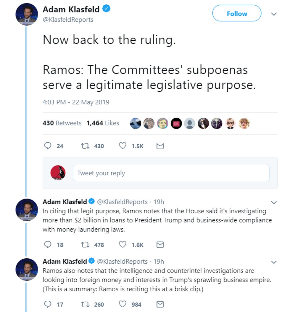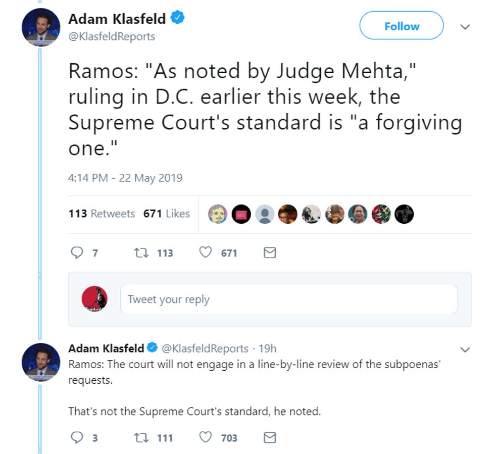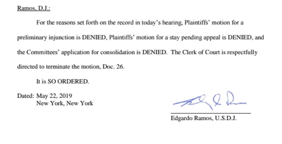 Judge Edgardo Ramos in the Southern District of New York heard oral arguments Wednesday in Trump's lawsuit to stop Deutsche Bank and Capital One from turning over his banking records. After the arguments had finished, Ramos took a recess for 10 or 20 minutes, and then came back ready to read his VERY LONG RULING from the bench, which means he is either a very fast typing mouse, or he already knew the answer to the question before Trump's dumbass lawyers even opened their mouths. And spoiler alert, Ramos ruled the subpoenas are valid, there will be no stay, there will be no injunction, do not pass go, FUCKING GIVE IT.