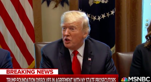 Underwood stresses that despite the dissolution of the Trump Foundation, the state's lawsuit is "ongoing." Incoming attorney general Letitia James had already promised to bring the ruckus to the Trumps. I get the feeling they're going to wish they'd never gotten into the fake charity business.