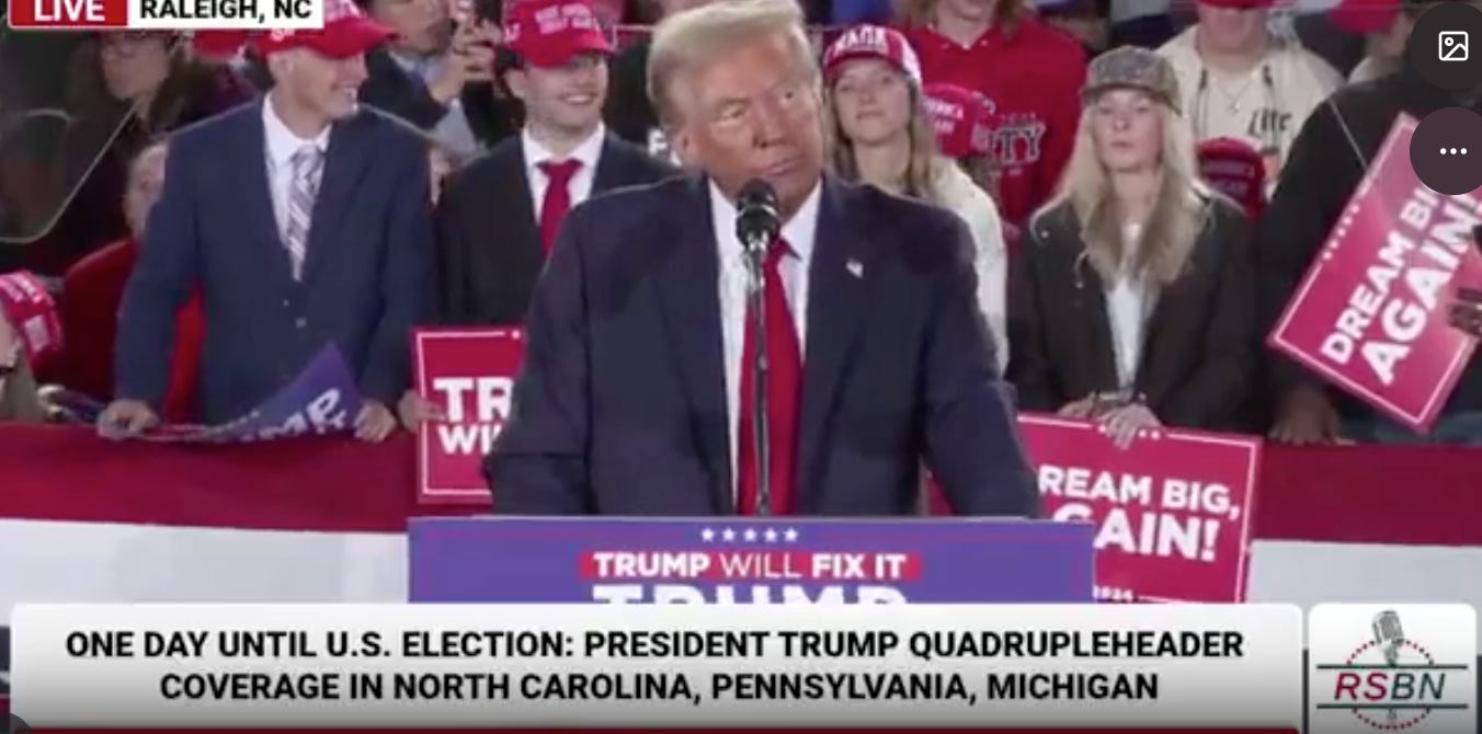 If you want a full rundown of Trump’s last rally last night — the one in Grand Rapids, Michigan, the one he was over an hour late for, which ultimately happened after midnight, he didn’t stop babbling until 2:00 a.m. — Aaron Rupar has a thread, just as he does for all the others. It’s got everything: Trump saying that “groceries” is an “old term”; Trump saying that "Many people say that God saved me in order to save America”; Trump calling Democrats the enemy within and all his other senile Nazi shit.