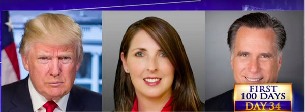 Ronna McDaniel is the RNC Chair formerly known as Ronna Romney McDaniel before Donald Trump reportedly demanded she change her name to Ronna Mellencamp (they compromised with Ronna McDaniel). Her job is to go around and pretend that Trump is a normal, poor-slapping Republican like her uncle. She reminds me of the creepy kid in horror movies who looks sweet and innocent but starts making increasingly alarming statements.