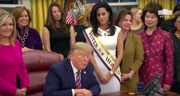 August 2020 will mark a century since women won the right to vote -- in the US -- as if they were humans and everything. Unfortunately, no matter how hard Nancy Pelosi tries, Donald Trump will most likely be president during this momentous occasion. Monday Trump signed the Women's Suffrage Centennial Commemorative Coin Act, and the super genius wondered why we waited until now to celebrate a centennial .