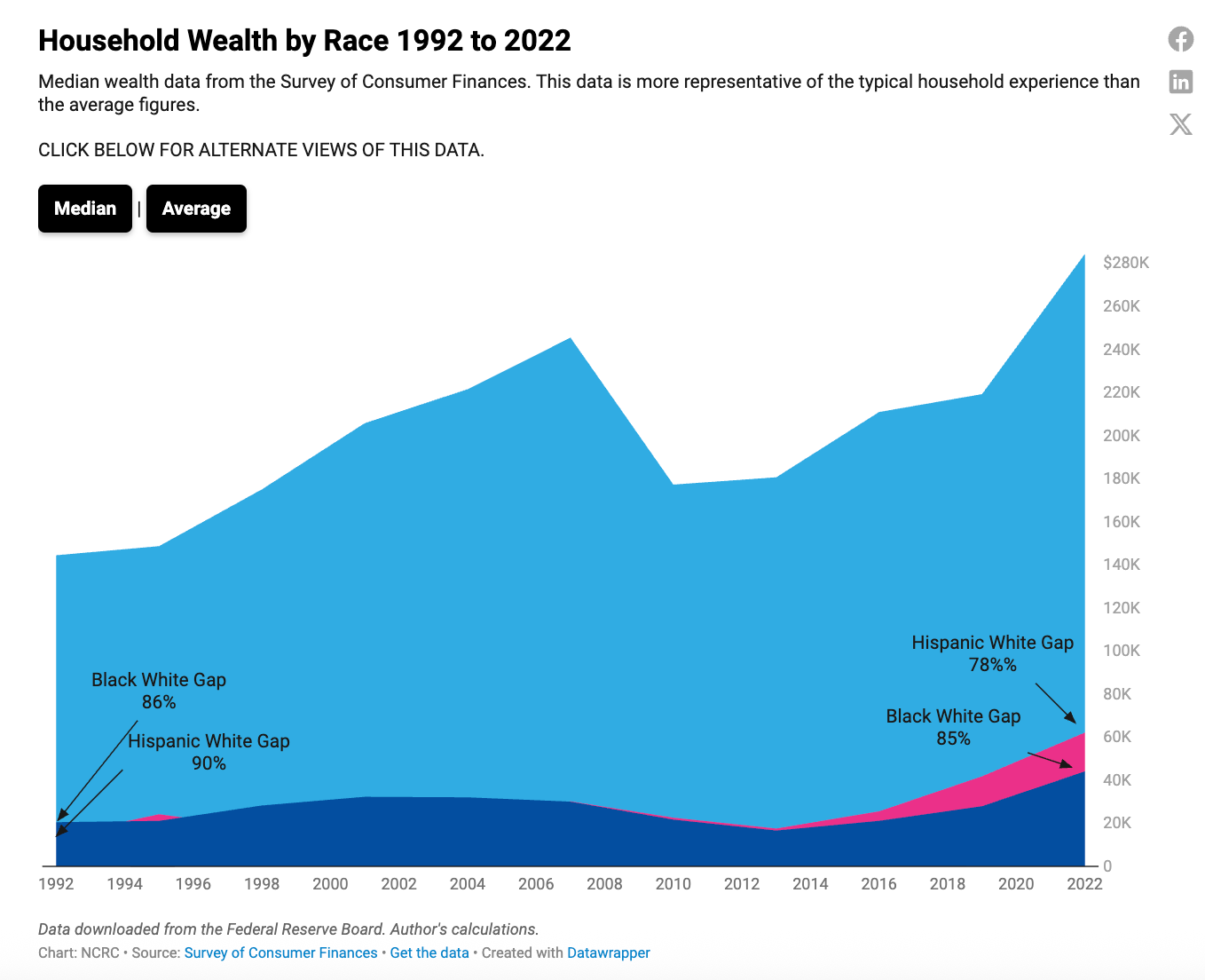 In 2022, the median White household held $284,310 in wealth, more than six times that of the median Black household at $44,100 and 4 times that of Hispanic households at $62,120. Black households have a wealth gap of 85% compared to White households, and Hispanic households have a wealth gap of 78%.
