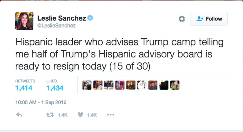 Upon hearing his speech on immigration yesterday, it seems that at least 15 of those advisors finally got the point. According to conservative pundit Leslie Sanchez, that's how many are geared up to resign.