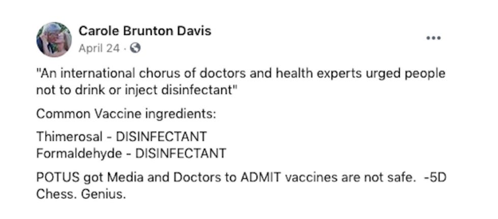 Carole Brunton Davis's Facebook feed is reportedly filled with QAnon conspiracy theories and assorted gibberish. She should not be professionally nursing.