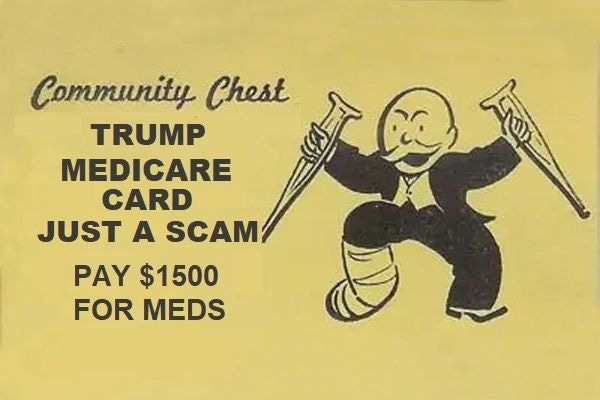 But when Dear Leader has a bug up his ass about something, his underlings can work wonders, so now there's a plan in place to send out letters next week to the 39 million Medicare beneficiaries who'll be getting the cards, to let them know Trump cares about them. At least when he's not calling for coronavirus policies that put their lives in danger. And the administration even came up with a way to pay for the roughly $8 billion program without getting an appropriation from Congress: Just dip into the Medicare trust fund, which is like free money, and if that leaves Medicare short of funds down the road, that'll be some later president's problem, suckers.