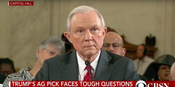 Sessions gave a speech Tuesday at Northwestern University on "The Real Meaning of the Trump Agenda." The college Republicans invited him to the campus so that decent people could boo him. This irritated Sessions, who just wanted to tell empathy-free young conservatives how WALL and whites-only immigration would best serve "the interests of Americans" from 1959.
