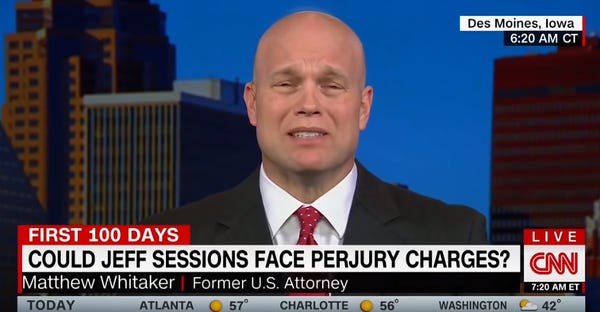 It's possible Whitaker isn't under investigation anymore. The Washington Post reports that the feds looked at Whitaker's dealings with the company "last year." WaPo also reports that when the FTC came a-calling with a subpoena for Whitaker's records, he told them to fuck off because he was too busy right then. All patriotic Americans know that if you get a subpoena and you are very busy, you just check off the box that says "BRB DOIN' STUFF" and the subpoena is rendered invalid.