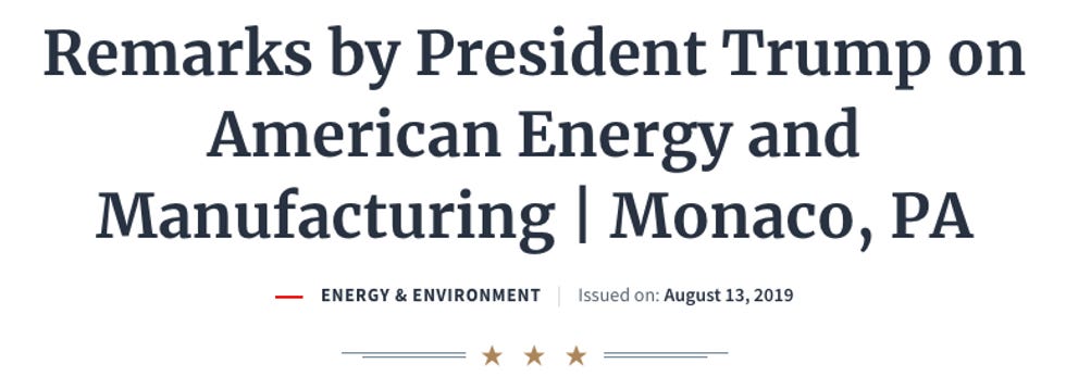Donald Trump would set fire to the last glacier on earth if it meant he could win Pennsylvania again in 2020. He spent the entire day yesterday in the swing state getting high on the fumes of burning hydrocarbons and his own flaming ego. And you, the lucky American taxpayer, paid for the matches! Because the White House isn't even pretending to segregate the people's business from campaign events, as every president since Reagan has done. They just book him at a Shell plant in Monaco, Pennsylvania, stick a regular MAGA rally speech on the Teleprompter, and call it Remarks on American Energy and Manufacturing.