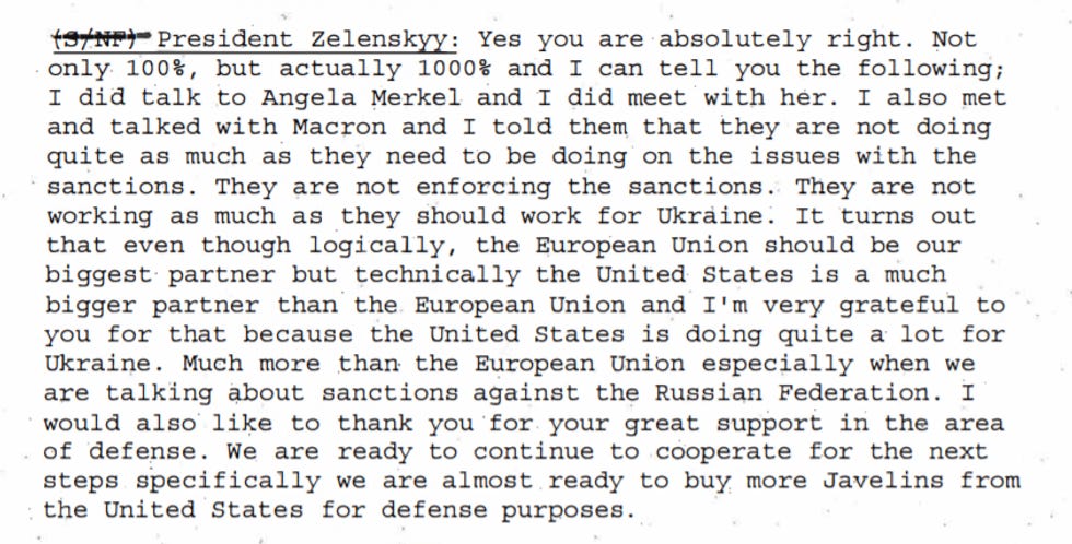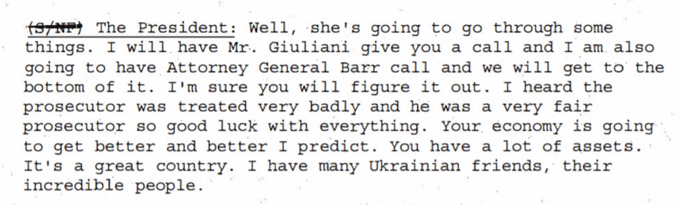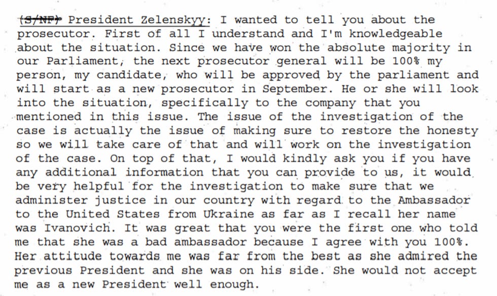 Zelenskiy at this point seems to be trying to get off the phone, says yadda yadda, yes, new prosecutor, blah blah blah, one time he stayed at Trump Tower, etc., etc., Ukraine cooperating with United States on stuff and things! HAVE A NICE DAY, DONALD.