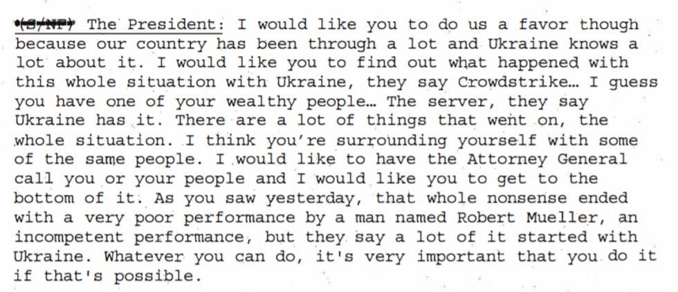TRUMP: I would like you to do us a favor though because our country has been through a lot and Ukraine knows a lot about it. I would like you to find out what happened with this whole situation with Ukraine, they say Crowdstrike ... I guess you have one of your wealthy people ... The server, they say Ukraine has it.