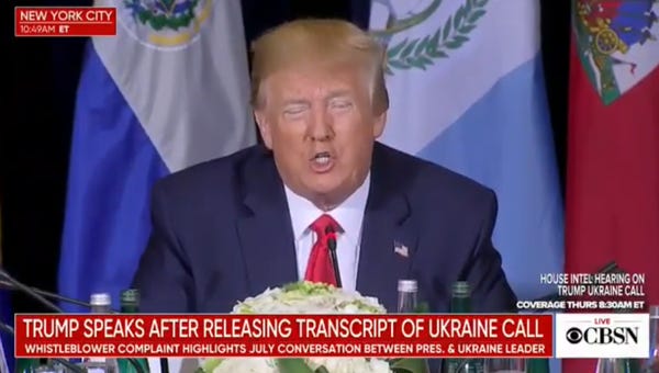 To be clear, there doesn't even need to be a quid pro quo to impeach Trump over this, because HE'S ASKING A FOREIGN NATION TO INVESTIGATE HIS POLITICAL OPPONENT TO HELP WITH HIS RE-ELECT. No collusion, indeed! But, you know, just for good measure, the quid pro quo is present in the snippet of the summary of the phone call with the Ukrainian president the White House deemed very legal and very cool enough to release.