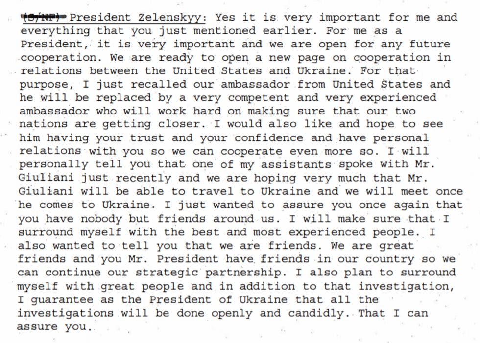 In response, Zelenskiy says oh yes Mister President, we will do all the things, we are best friends, ayup, you betcha, and also mentions that his people have been talking to Rudy Giuliani for some reason :