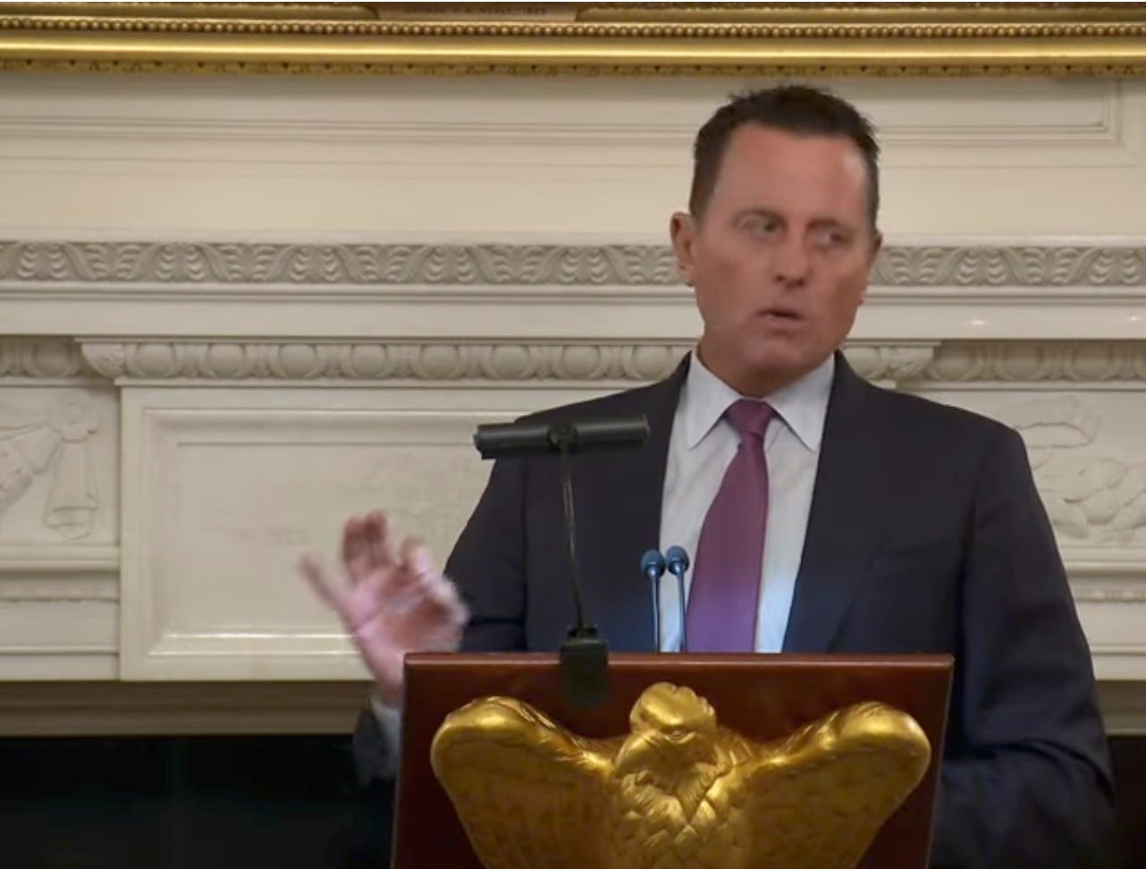 Intriguing character, that Ric Grenell. During Trump’s last campaign, he was the only person who was able to lure Melania out of her gazillion-dollar closet to come wheedle money at his Log Cabin Republican lunch, which was her only campaign appearance other than the convention. (Where IS Melania, anyway? Is she even in DC?)