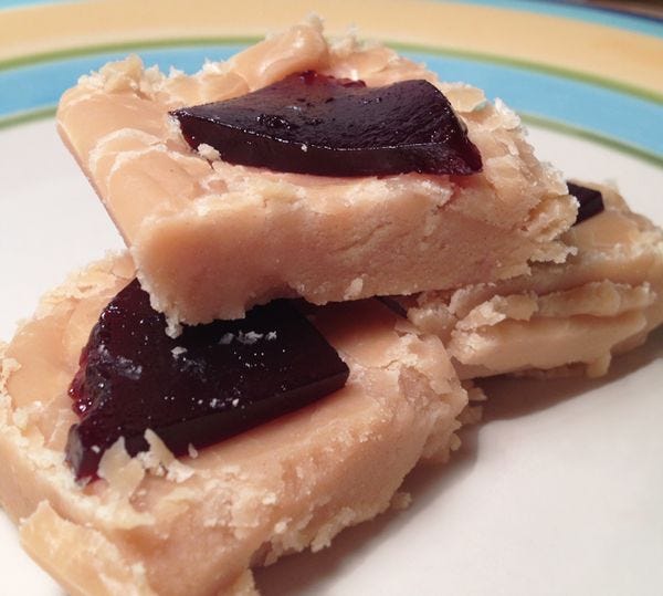 It looked like it needed something on top, so I opened a failed red grape jelly that I botched over the summer. Failed jelly is too stiff for sandwiches but it goes well with roasted pork so I kept it. For our fudge-related mission, I chopped up a few sliced of the red grape jelly and dotted the top of the pan. PB & J, right? I know. The pan rested in the fridge for about four hours.