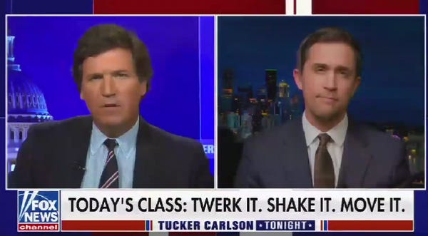 No, that's enough about them. Instead, here are Tucker Carlson and Chris Rufo, the guy who admits he made up the white racist panic over Critical Race Theory, and who has apparently moved on to lying about and inciting hatred against LGBTQ people. Why? Don't know.