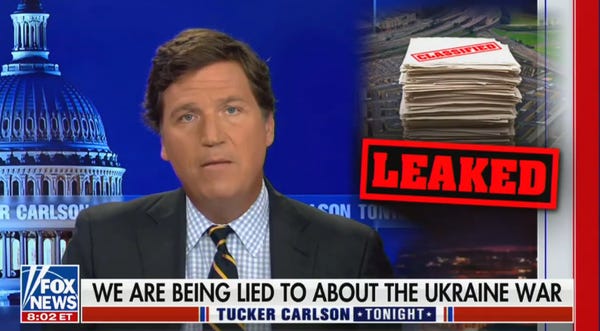 Tucker has been lying and misleading his viewers about the latest accused leaker of classified information pretty much since the get-go, trying to turn the loser into some hero for the (Russian) cause of revealing the TRUTH about what's going on in in Ukraine. (Not the truth.) He's also been using facts and figures from the documents to convince his very idiot viewers that the presence of 14 US special forces attached to the embassy in Kyiv means Joe Biden has been lying and America is in a HOT WAR with Ukraine.