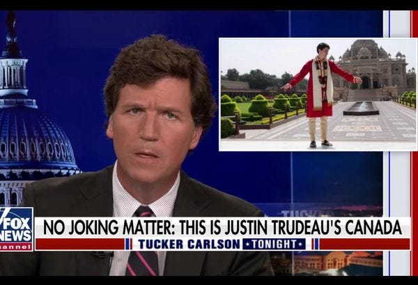 Carlson sure tried to make it all seem terrifying, eh? He made sure to call Trudeau "Mussolini" and to include photos of the PM wearing a weird funny foreigner "costume," too (from a trip Trudeau made to India).