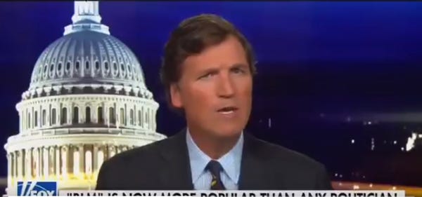 Tucker bemoans that Rasmussen finds Black Lives Matter is more popular than Joe Biden and Jesus and Congress and the Pope and everything else too! Do you know how many white people Black Lives Matter is more popular than? Tucker does! He is making a list of them, probably!