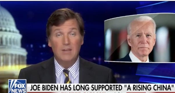 Blaming China exclusively for the coronavirus outbreak while ignoring the mistakes America made as the virus spread completely unchecked within our borders seems right up your average white supremacist's alley. Last night, Tucker Carlson claimed Joe Biden was a longtime supporter of China, a nation that has screwed America consistently, according to Carlson's unique interpretation of history.