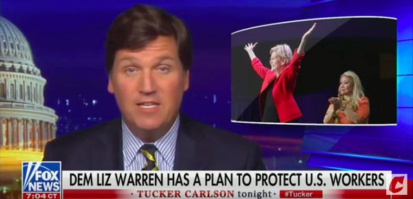 Warren isn't piggybacking off Trump's "America first" bullshit. When Carlson and his colleagues at Fox were crying into their pillows on election night 2012, Warren was serving notice in her Senate victory speech.