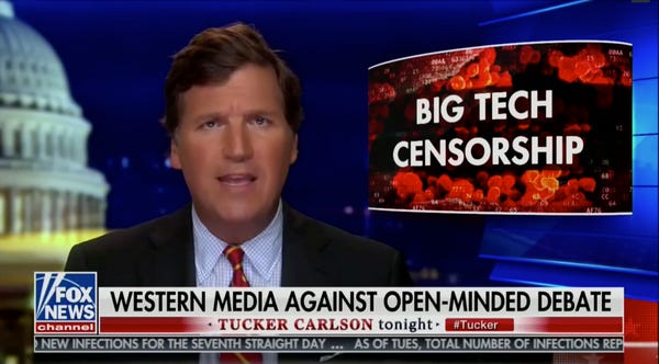 This isn't just censorship, Carlson claimed. It is social media companies hating "the scientific method" — because apparently if they loved the "scientific method" they would be okay with Aunt Carol spreading potentially dangerous theories and misinformation online, in the name of "scientific inquiry." That, really, doesn't make much sense either.