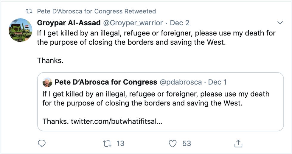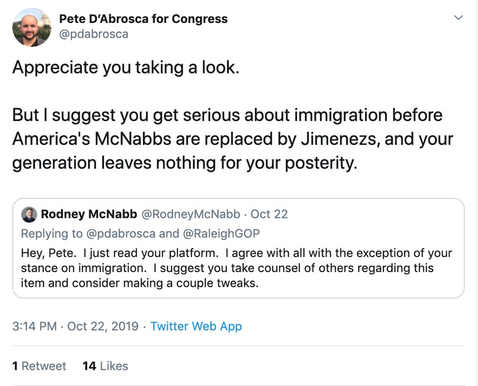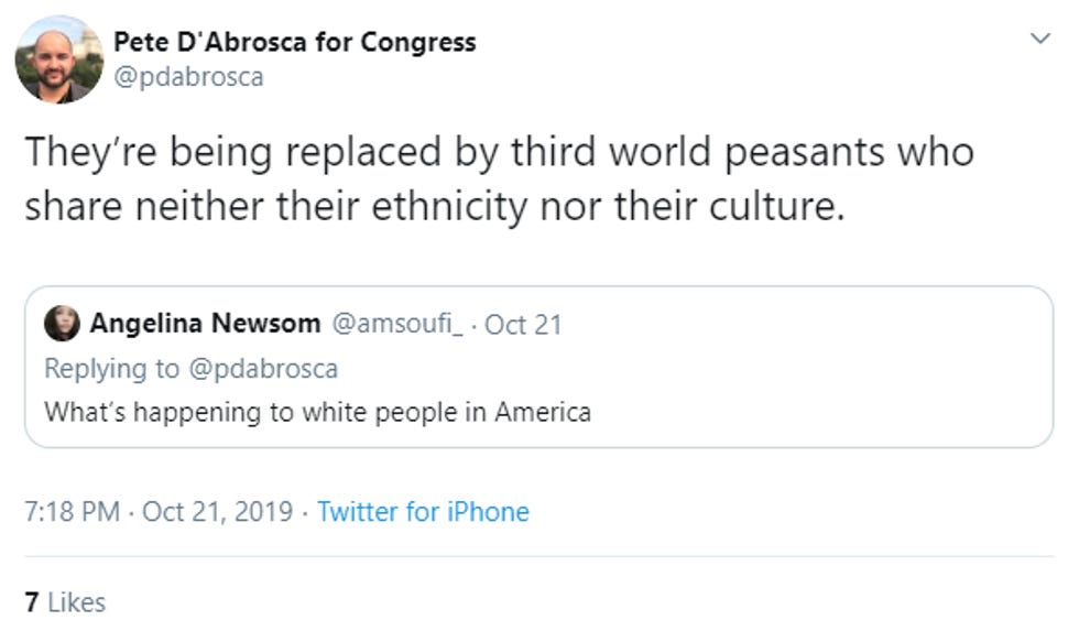 Meet Pete D'Abrosca! Pete D'Abrosca is a Republican running for a Congressional seat in North Carolina's 7th district. He is also a big proponent of the white nationalist "Great Replacement" theory and an advocate of banning immigration entirely, on account of how he is sick and tired of seeing white people replaced with "peasants." Yes, he actually says "peasants," like he is Margeaux on Punky Brewster or some shit.