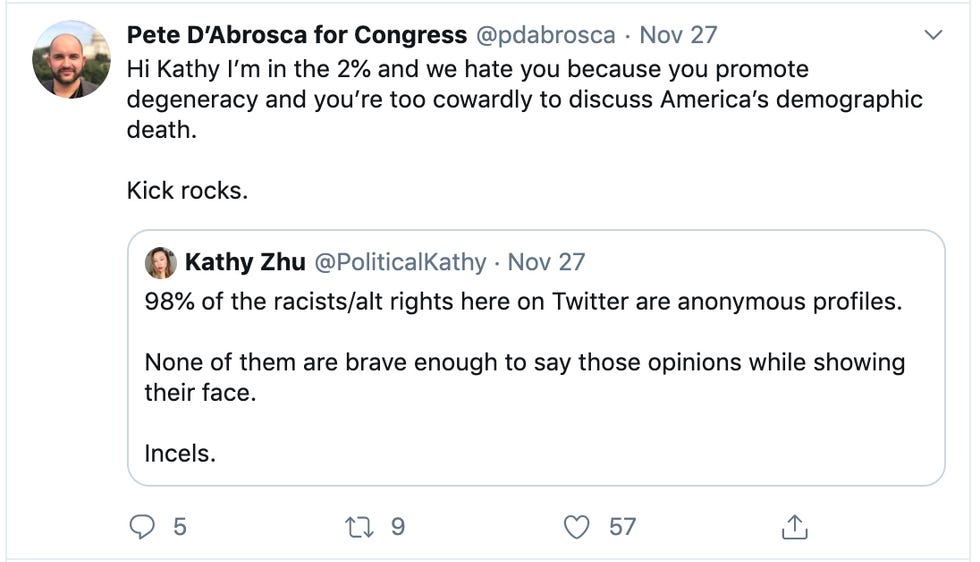 D'Abrosca has a long history of saying a lot of gross racist, anti-LGBTQ, xenophobic things, is beloved by the white nationalist site VDARE and by Ann Coulter, and in any normal timeline would be a weird fringe candidate that people cringe-laugh about for two seconds and then forget about forever. Like that "I'm not a witch! I'm you! " lady that I went as for Halloween one year.