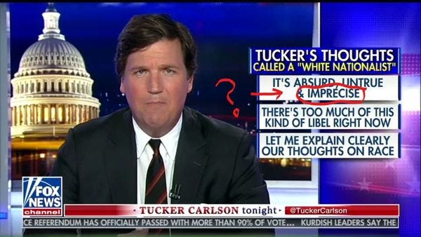 Tucker Carlson objects to be being called a "white nationalist" because it is "imprecise" ? pic.twitter.com/wKYPxXzhqG