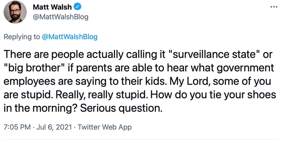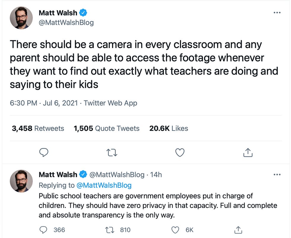 Walsh would likely protest most bitterly if parents with trans kids pulled footage to confirm that conservative teachers weren't misgendering them. Or if parents checked to see how often girl students were called on compared to their male classmates. Then he'd rail about “Big Brother" and the surveillance state.