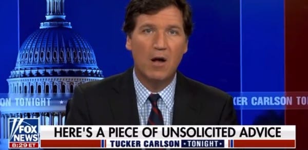 Tucker doesn't want to talk about COVID anymore, and he says if you live somewhere that people still talk about COVID, even after all these (two) years, you should move. He says talking about COVID after all these (two) years is like if you told everybody about your prostate every day. No, really. "Imagine telling people about your prostate every day," says Tucker, with his words. He says sure, COVID has killed a lot of people (over 800,000 in America), but prostate cancer kills too (34,000 this year per Aaron Rupar, who'd better be right because we're too lazy to look it up).