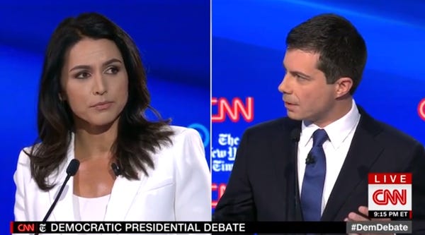The nexus of those two things made for perhaps the most interesting moment of the night, when Gabbard decided to spit out a bunch of verifiable lies about what Donald Trump has done to Syria, somehow managing to bolster the positions of both Trump and (surprise!) Syrian dictator Bashar al-Assad. Pete Buttigieg, as the other person with military service on the stage, was not about to put up with that horseshit.